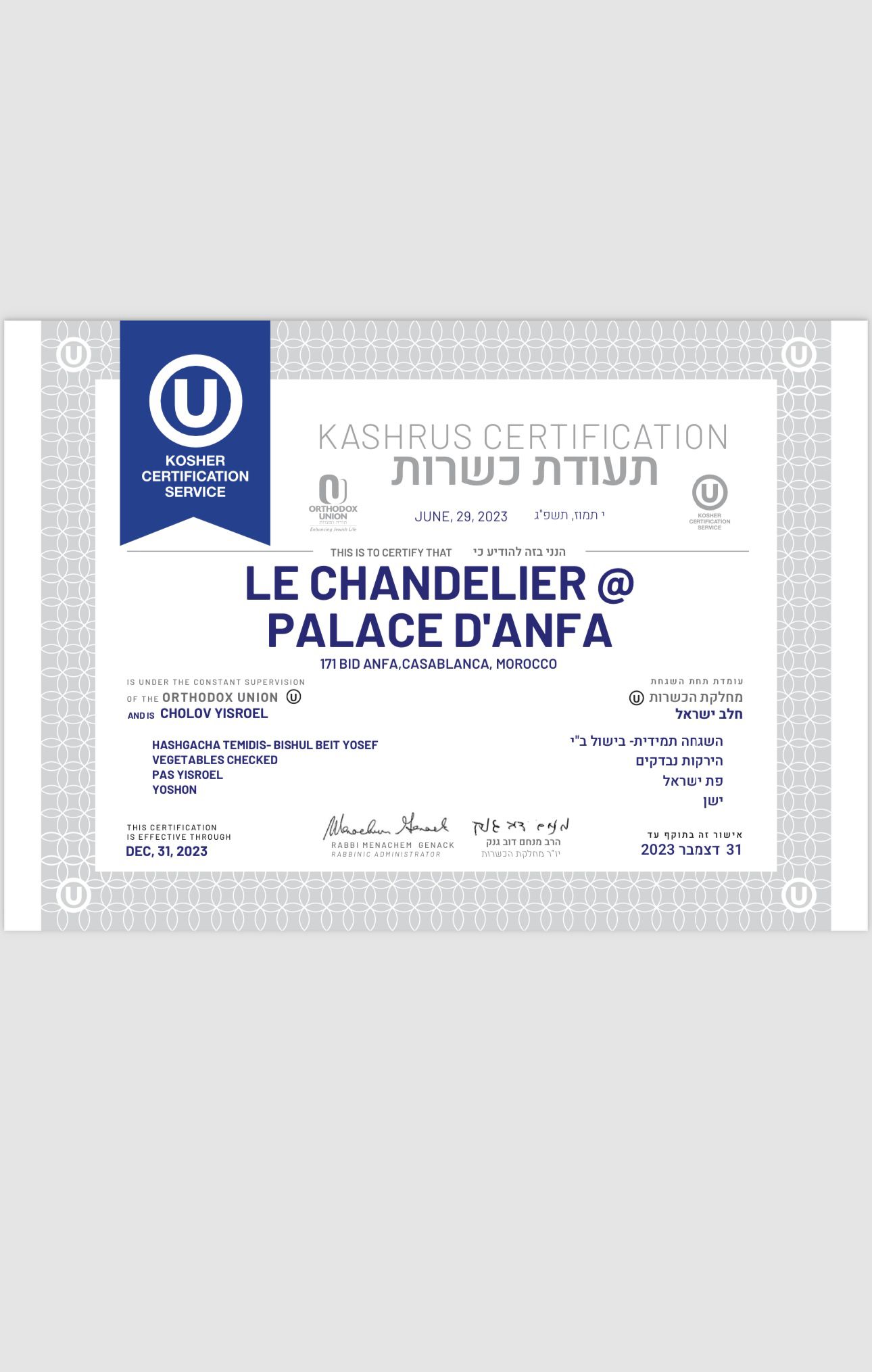 Discover an exceptional culinary experience at the heart of our three Glatt Lamehadrin kosher restaurants (under the supervision of : Orthodox Union USA and the Kashrut Commission of Casablanca), the only ones in Morocco.